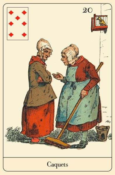 Dans les fiches mots-clĂ©s, on peut se rĂ©fĂ©rer Ă ceux indiquĂ©s pour Caquets (7 de âŠïž) qui sont les suivants : vĂ©ritĂ© rĂ©vĂ©lĂ©e, retour de karma, rumeur Ă©touffĂ©e.