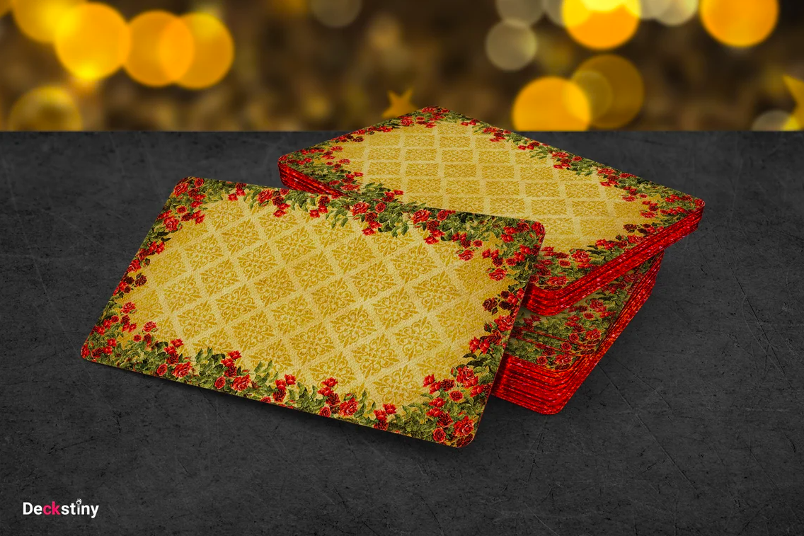 🤏 Qualité : 330 GSM mat - Personnages en vernis sélectif - Bordures rouges à paillettes